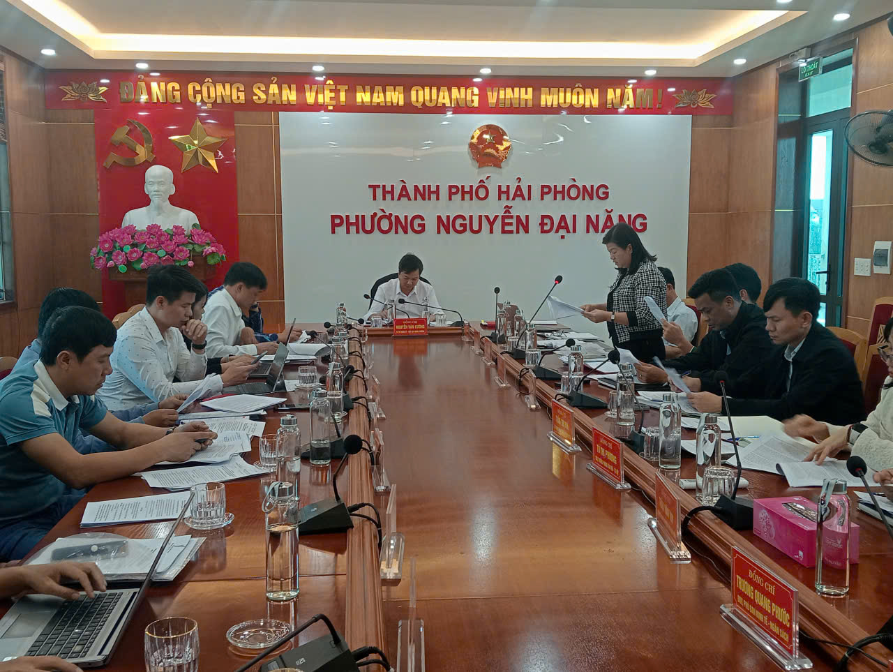 Đồng chí Nguyễn Văn Hoàn, Phó Bí thư Đảng ủy, Chủ tịch UBND phường – Chủ tịch Uỷ ban bầu cử HĐND phường chủ trì cuộc họp. Dự họp có các đồng chí: Vũ Ngọc Học, Ủy viên Ban Thường vụ Đảng ủy, Chủ tịch UBMTTQ Việt Nam phường – Phó Chủ tịch Uỷ ban bầu cử HĐND phường; Phạm Bá Tuyến, Ủy viên Ban Thường vụ Đảng ủy, Phó Chủ tịch UBND phường – Phó Chủ tịch Uỷ ban bầu cử HĐND phường; các đồng chí Ủy viên Ủy ban bầu cử HĐND phường; đại diện lãnh đạo phòng, bam của phường.