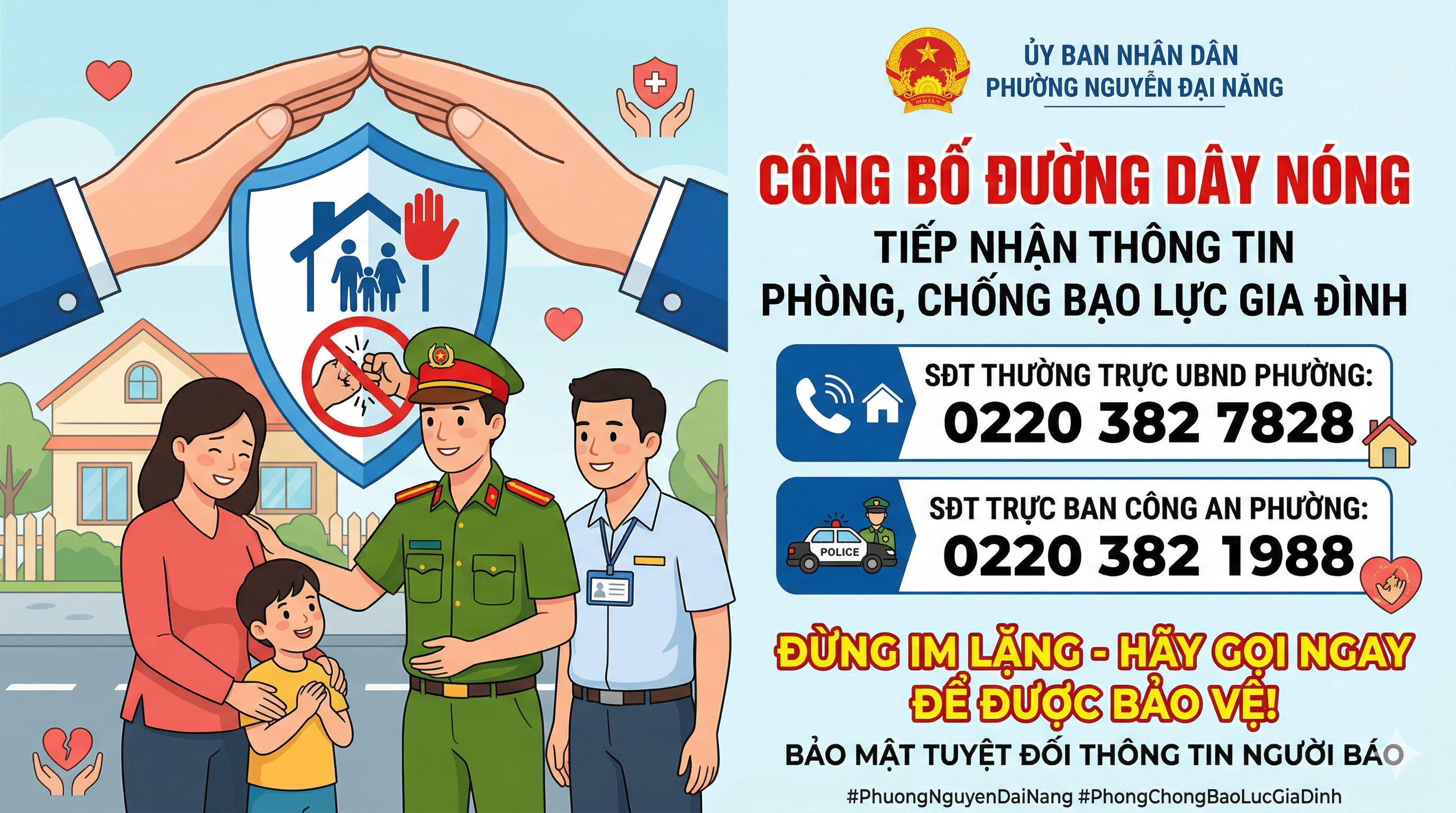 Gia đình là tế bào của xã hội, là nơi chốn bình yên của mỗi người. Nhằm kịp thời hỗ trợ, bảo vệ an toàn cho người dân và xử lý nghiêm các hành vi bạo lực gia đình, UBND phường Nguyễn Đại Năng chính thức thiết lập và công bố các số điện thoại đường dây nóng hỗ trợ khẩn cấp trên địa bàn như sau: