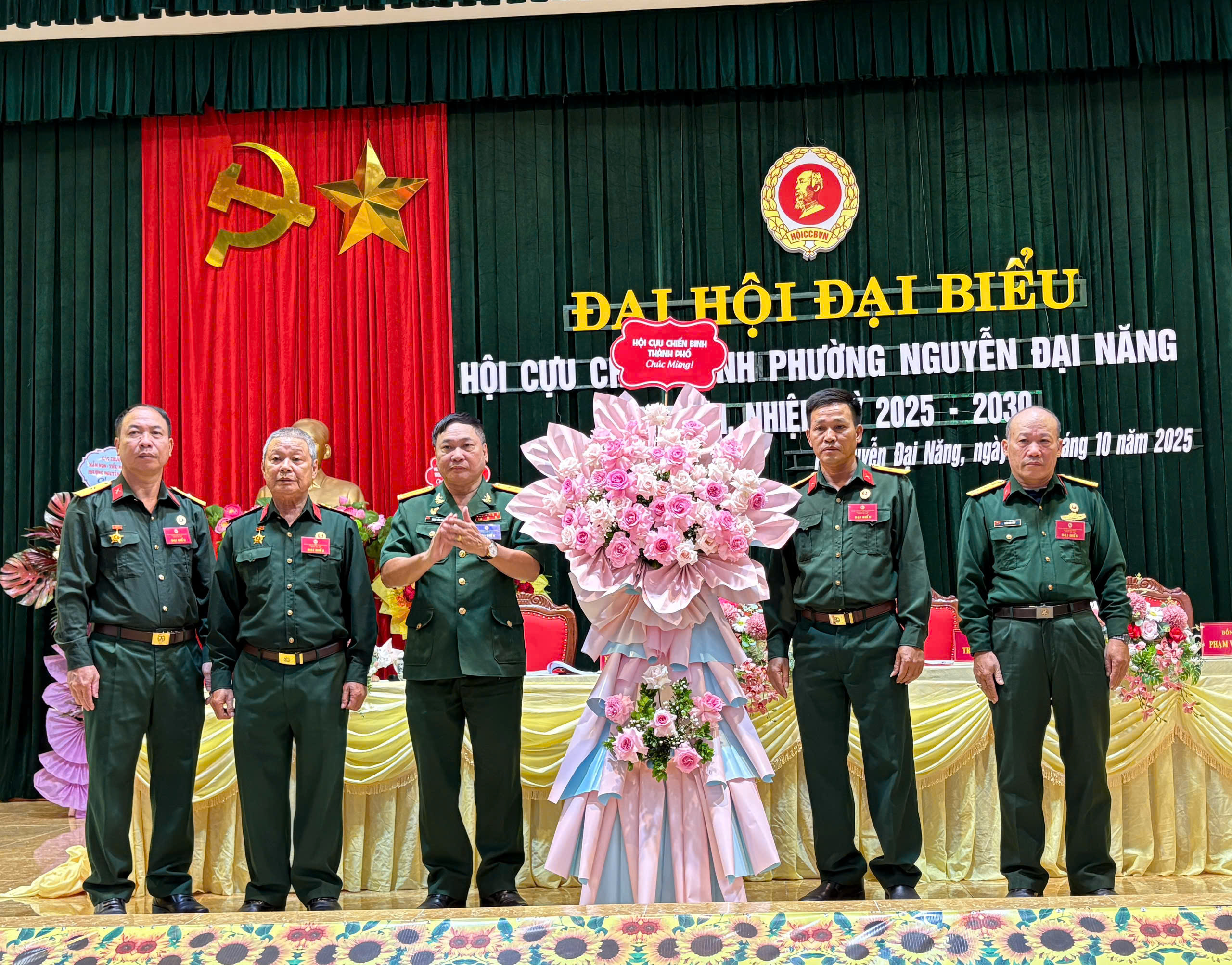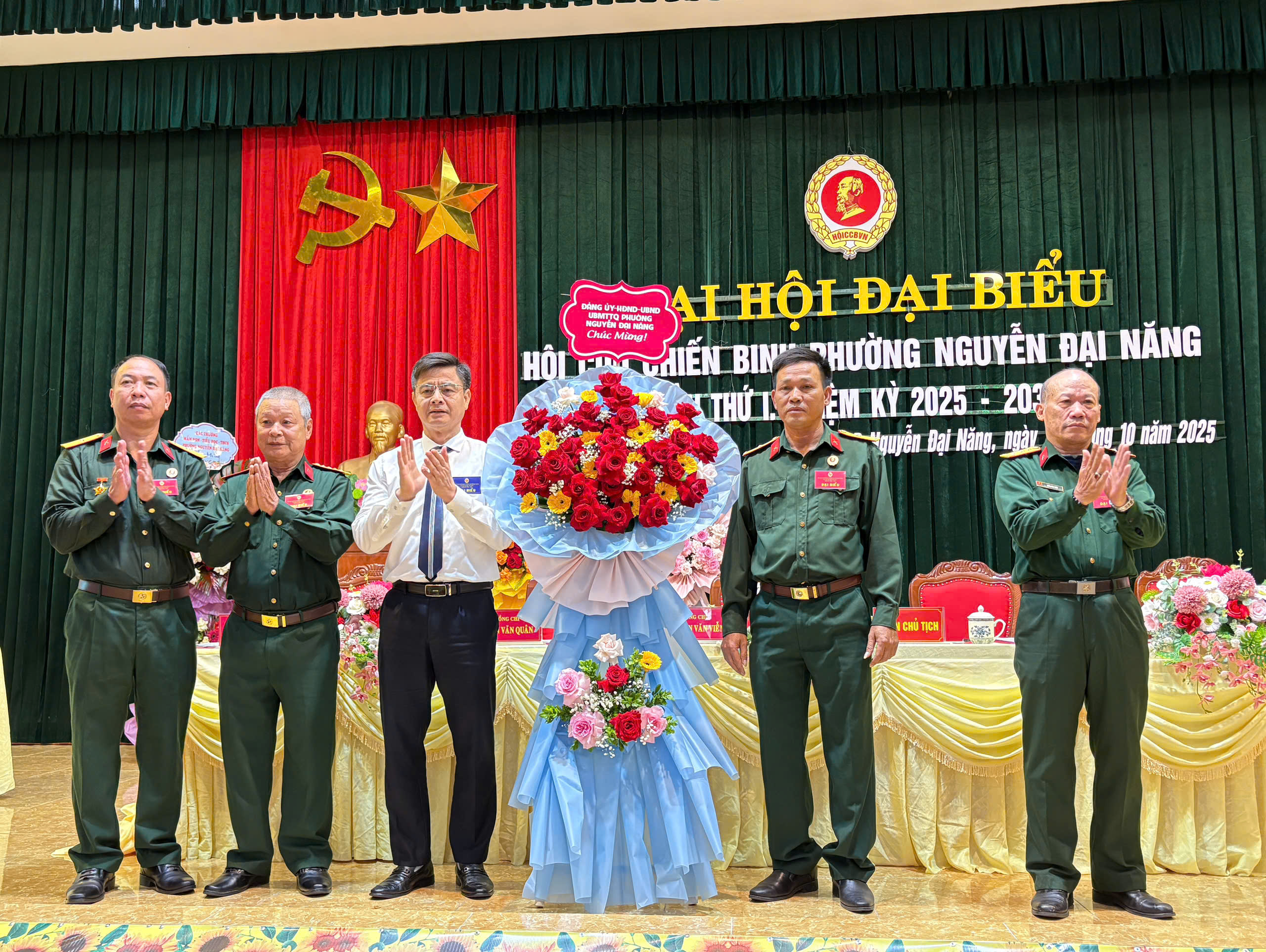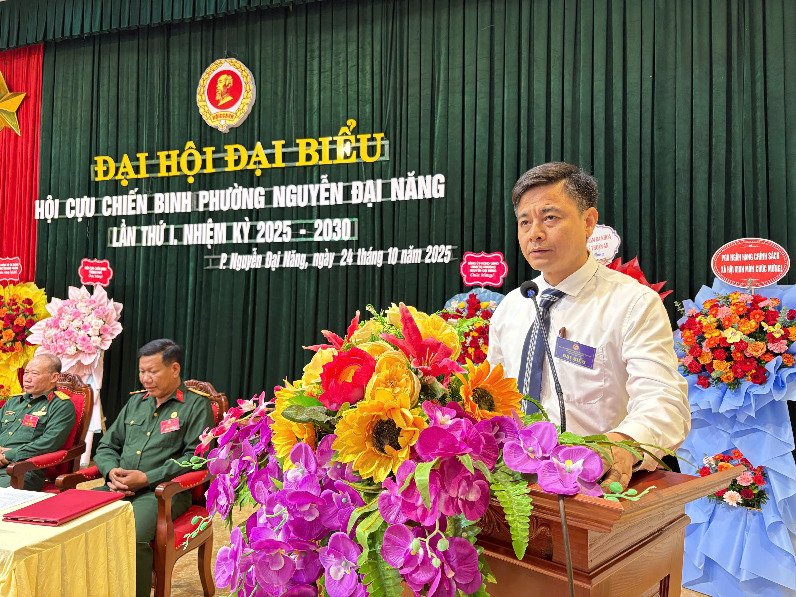 Đồng chí Nguyễn Văn Cường – Bí thư Đảng ủy, Chủ tịch HĐND phường tặng hoa chúc mừng Đại hộiVề phía phường Nguyễn Đại Năng có các đồng chí: Nguyễn Văn Cường – Bí thư Đảng ủy, Chủ tịch HĐND phường; đồng chí Nguyễn Thị Oanh – Phó Bí thư Thường trực Đảng ủy; đồng chí Nguyễn Văn Hoàn – Phó Bí thư Đảng ủy, Chủ tịch UBND phường; đồng chí Vũ Ngọc Học – Ủy viên Ban Thường vụ Đảng ủy, Chủ tịch Ủy ban MTTQ Việt Nam phường; cùng các đồng chí trong Ban Thường vụ, Ban Chấp hành Đảng ủy, lãnh đạo các phòng, ban, ngành, đoàn thể, các trung tâm, Bí thư chi bộ, Hiệu trưởng các trường Mầm non, Tiểu học, Trung học cơ sở trên địa bàn phường và 112 đại biểu cựu chiến binh chính thức đại diện cho các hội viên trong toàn phường.