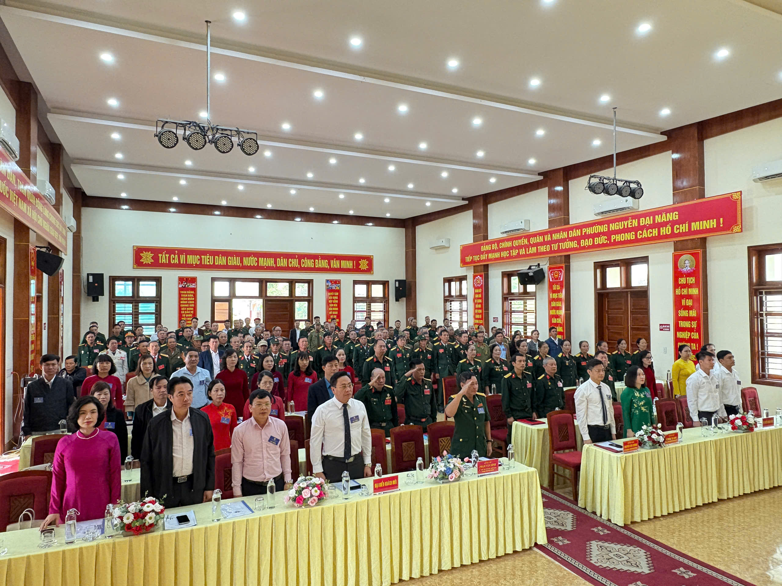 Các đồng chí lãnh đạo và đại biểu dự Đại hội thực hiện nghi thức chào cờSáng ngày 24/10/2025, tại Nhà văn hóa trung tâm phường Nguyễn Đại Năng, Hội Cựu chiến binh phường long trọng tổ chức Đại hội đại biểu Hội Cựu chiến binh phường Nguyễn Đại Năng lần thứ I, nhiệm kỳ 2025 – 2030.